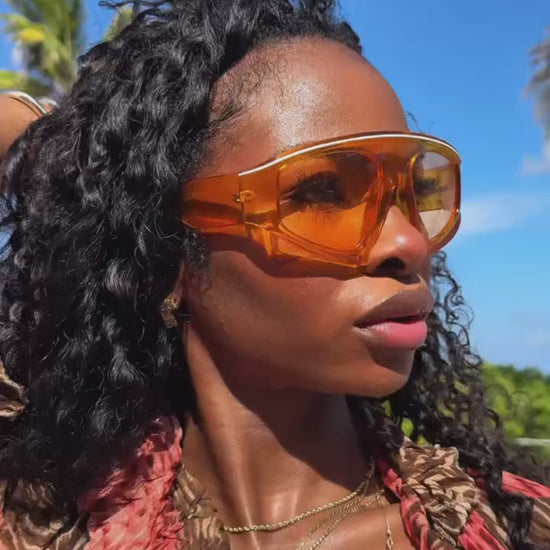 Step into bold style with these statement-making amber shield sunglasses. Featuring a futuristic wrap-around frame and tonal orange lenses, they deliver both high-impact fashion and full coverage. The chunky temples add an edgy, modern twist while ensuring a comfortable fit. Perfect for festival days, city strolls, or any moment you want your look to stand out.