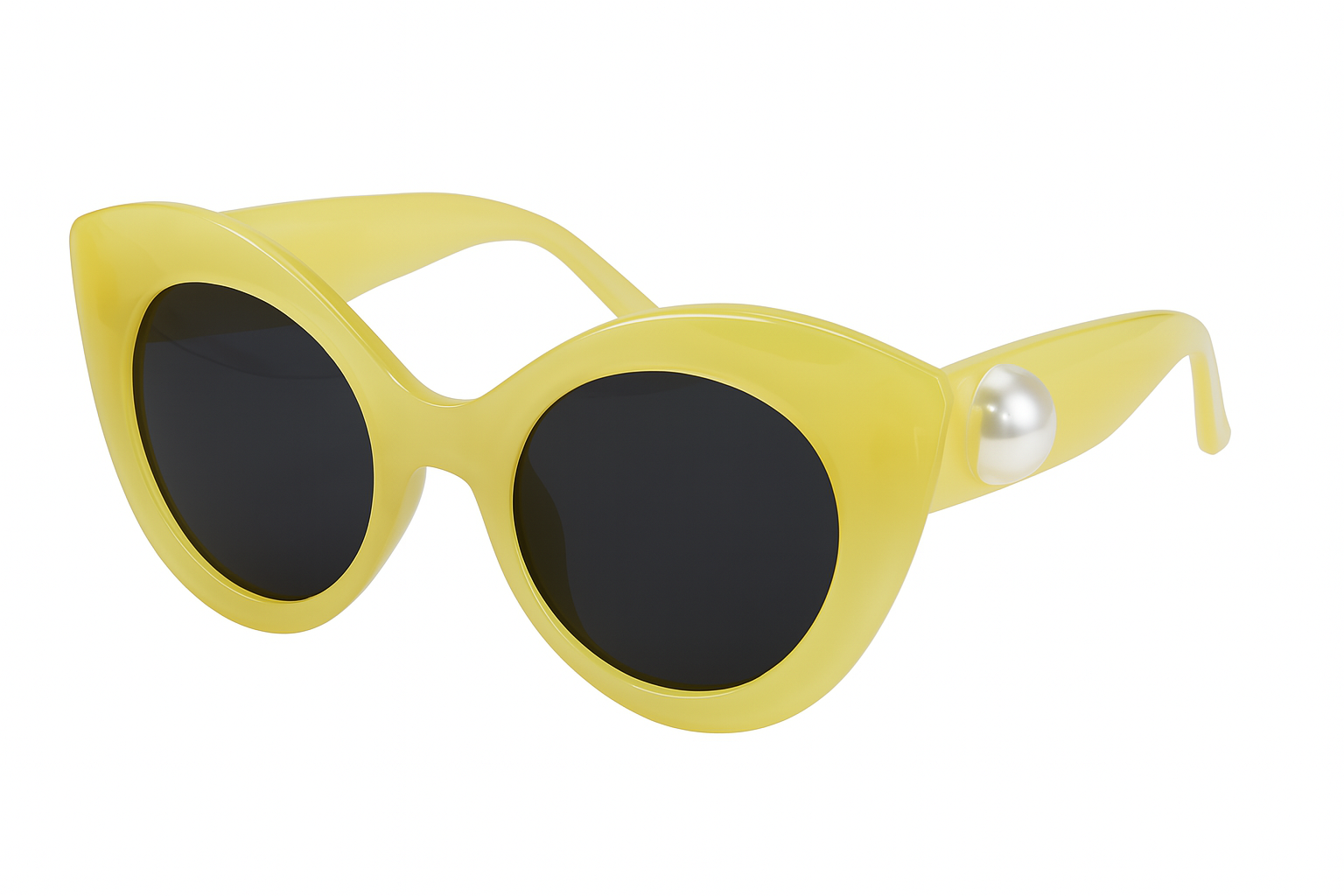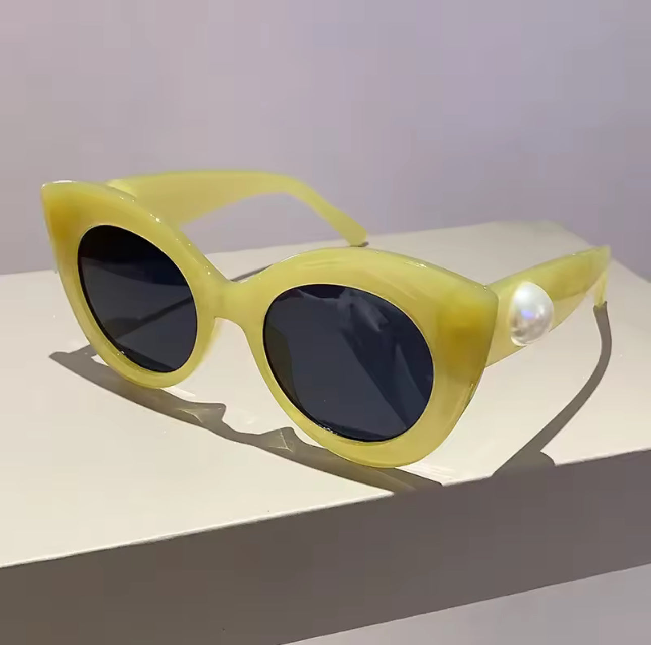 Make a statement in our Pearl Glow Sunnies, designed to turn heads with their retro cat-eye silhouette and soft green acetate frame. Featuring oversized black lenses for UV Protection and a signature pearl detail at the temple.
