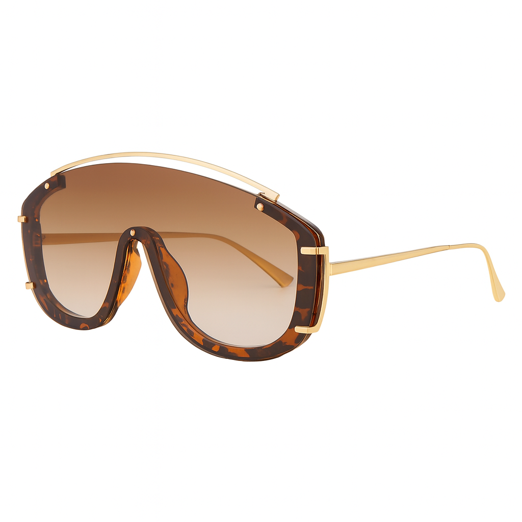These oversized shield sunglasses bring instant drama with their sculpted tortoiseshell frame, gradient brown lenses, and sleek gold accents. The futuristic visor silhouette is elevated by a chic brow bar and ultra-slim gold temples, striking the perfect balance between sporty edge and high-fashion glamour. Whether poolside, front row, or city-strolling, these sunnies are made to turn heads and command attention.